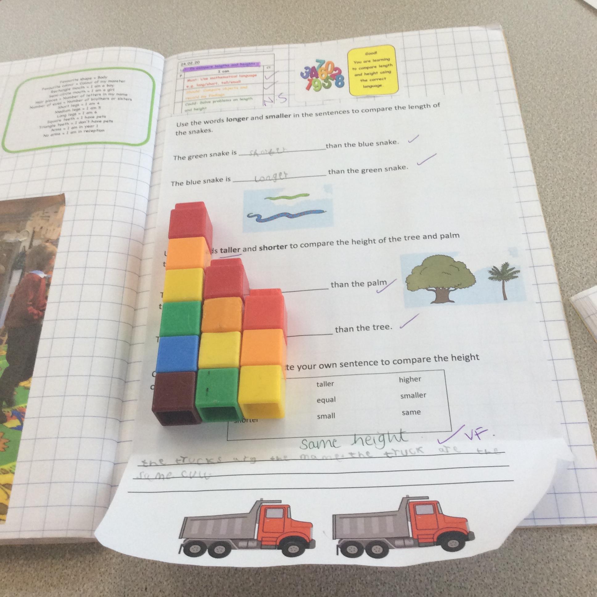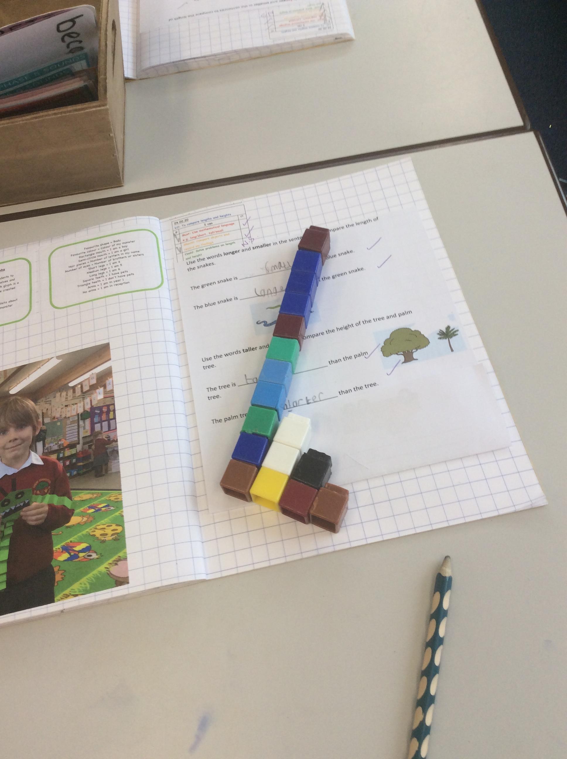 In Maths this week we have been learning about measuring length and height using non-standard units of measure. The children used cubes to measure the length of different objects and recorded what they found out. Later in the week we learnt how to use a ruler to measure in centimetres and how to draw lines to a certain length.